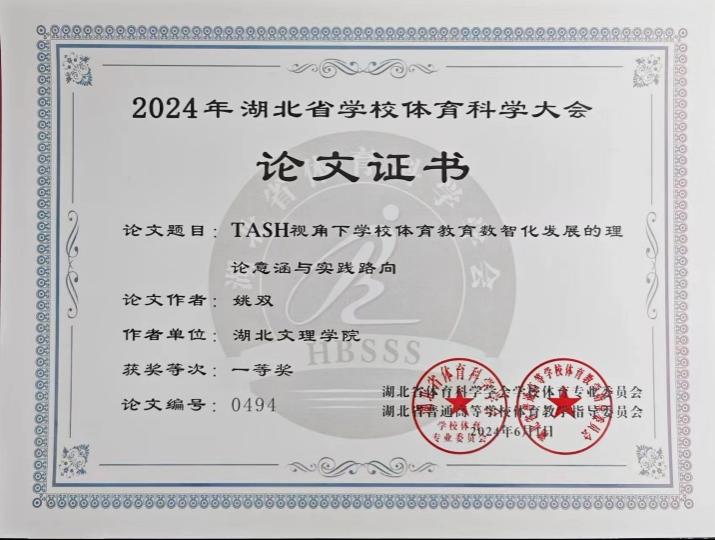 通讯员 张明月)2024年6月1日,湖北省学校体育科学大会在长江大学隆重举行,我院在读研究生姚双同学参加,并凭借其出色的论文《TASH视角下学校体育教育数智化发展的理论意涵与实践路向》荣获大会一等奖。