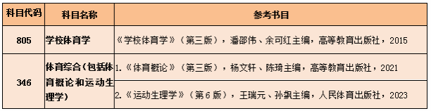 复试科目: 1.综合素质测试 2.专业理论课复试《学校体育学》 参考书目:《学校体育学》(第三版),潘邵伟、余可红主编,高等教育出版社,2015。 3.运动专项技能复试(项目不限) 4.外语听力口语测试 5.同等学力考生需加试科目:《体育心理学》、《运动解剖学》 参考书目:1.《体育心理学》(第三版),季浏、殷恒婵、颜军主编,高等教育出版社,2016; 2.《运动解剖学》(第三版),杨桦主编,北京体育大学出版社,2021。 |