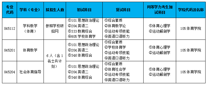 复试科目: 1.综合素质测试 2.专业理论课复试《学校体育学》 参考书目:《学校体育学》(第三版),潘邵伟、余可红主编,高等教育出版社,2015。 3.运动专项技能复试(项目不限) 4.外语听力口语测试 5.同等学力考生需加试科目:《体育心理学》、《运动解剖学》 参考书目:1.《体育心理学》(第三版),季浏、殷恒婵、颜军主编,高等教育出版社,2016; 2.《运动解剖学》(第三版),杨桦主编,北京体育大学出版社,2021。 |